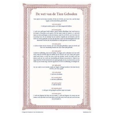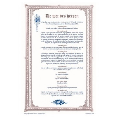 Deze prachtplaat met de afbeelding van de tekst van de Wet des HEEREN voldoet al vele jaren, maar is nu mooier uitgevoerd op geelachtig luxe papier. Nu in twee kleuren, donkerrood en blauw